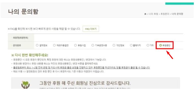 클릭하면 여러 유형의 문의종류가 나오는데요, 여기서 마지막에 '후원중단' 이라고 있습니다. 굿네이버스 후원취소 라면 이 유형을 클릭하면 되겠죠? 그럼 간단한 질문에 답을 하고 접수만 하면 후원취소 접수가 마무리 됩니다.