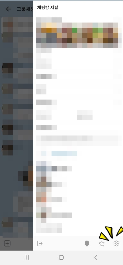 채팅방에 들어가서 오른쪽 상단에 三 모양의 메뉴를 누른다음 하단에 톱니바퀴 모양의 설정 버튼을 눌러줍니다.