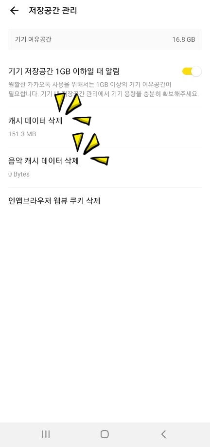 여기서 저장된 캐시 데이터 삭제를 눌러주면 지금까지 계속 쌓이고 있던 캐시가 지워지면서 카카오톡 용량이 줄어듭니다.