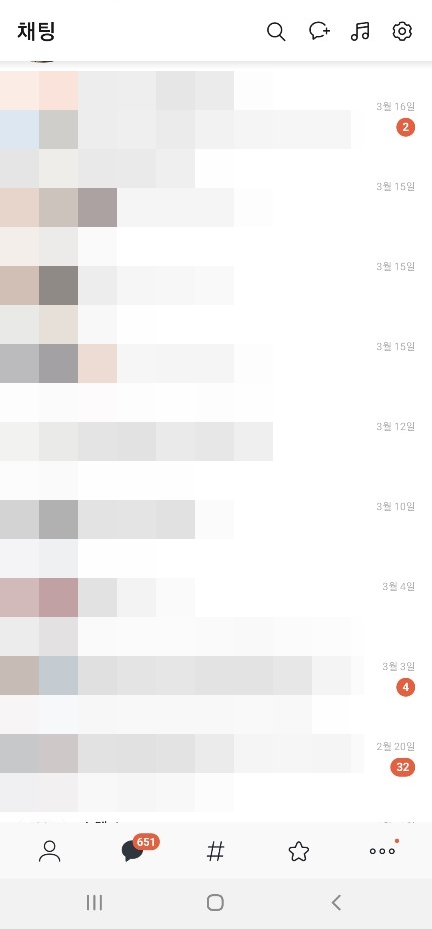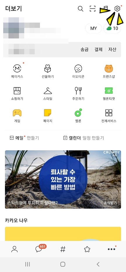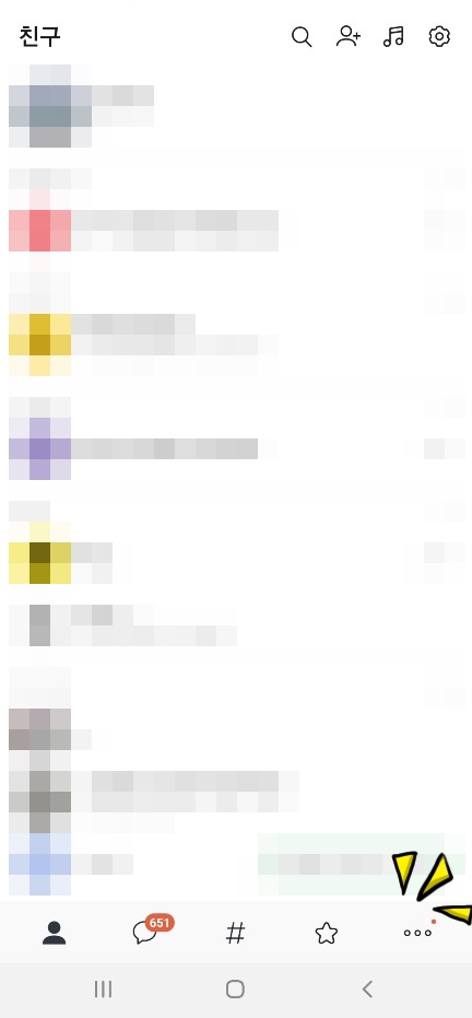 먼저 화면 오른쪽 하단에 점 3개 아이콘을 터치해 준다음, 오른쪽 상단 톱니바퀴 모양의 설정 메뉴를 눌러줍니다. 갤럭시, 아이폰 모두 동일한 위치에 있어요.